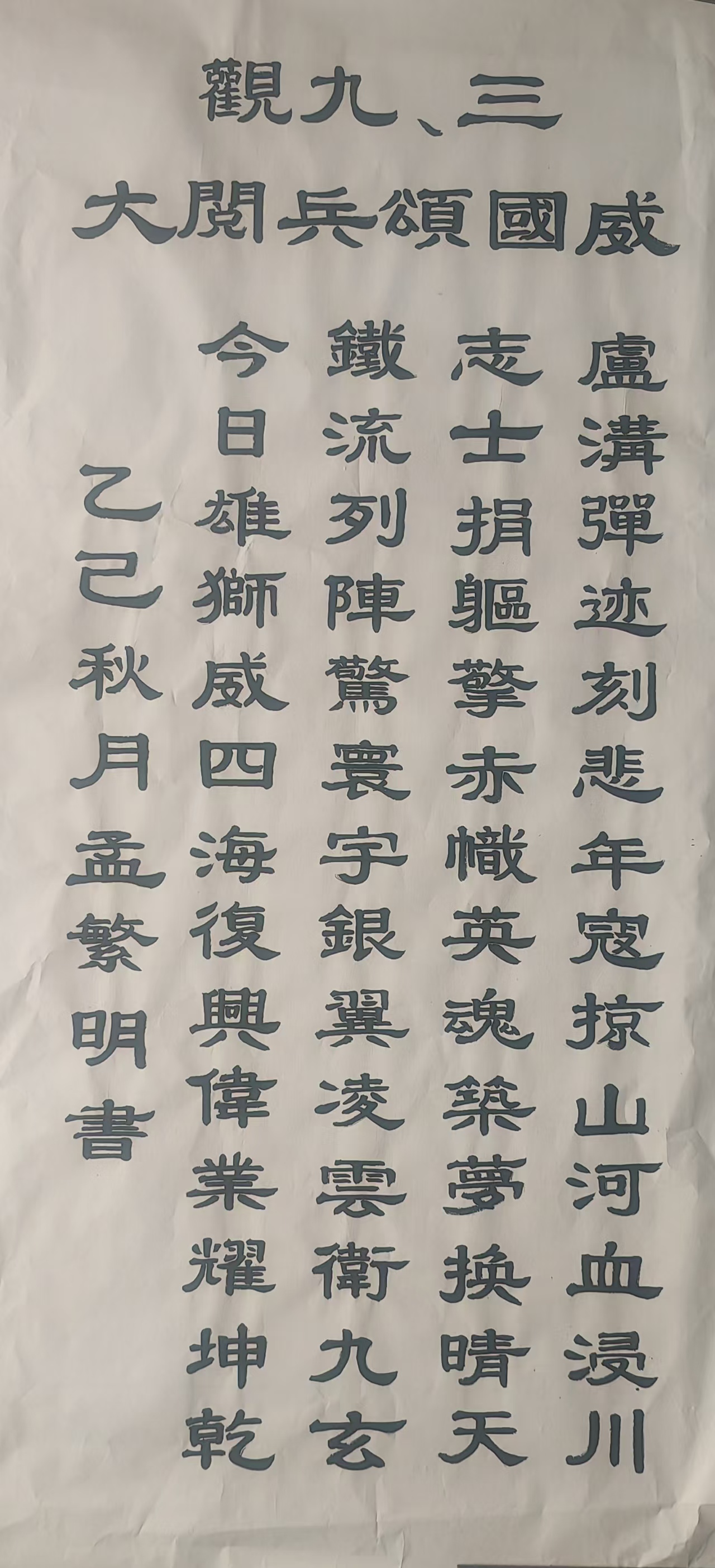 孟繁明,男,1953年3月10日出生,大专学历。书法作品多次参加国家、省、市、区书画大赛并获奖。2013年在滨州市书画协会组织的书法大赛中获得二等奖;在今年全国“同心共筑中国梦”书画大赛中,其书法作品:二月份和四月份均获三等奖,五月份获二等奖并被国家收藏;在全国“同心共筑中国梦”书画大赛第一期大赛中,书法作品《千字文》获优秀奖并被国家收藏。现为滨州市名风书画院院长,滨州市鸿宝斋斋主,滨州培风书院常务副院长,老干部之家书画协会会员,滨州市书法协会会员,滨州市书画研究会会员,滨州火天印社会员。