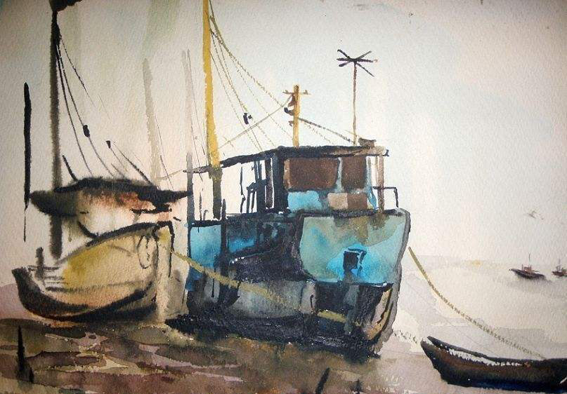 水彩画“柳荫渔歌”、“壮年”入选《第六届全国美展》