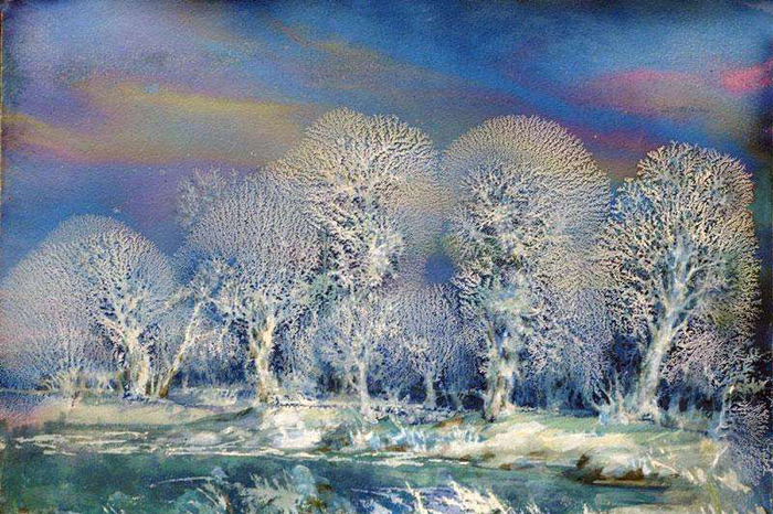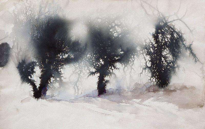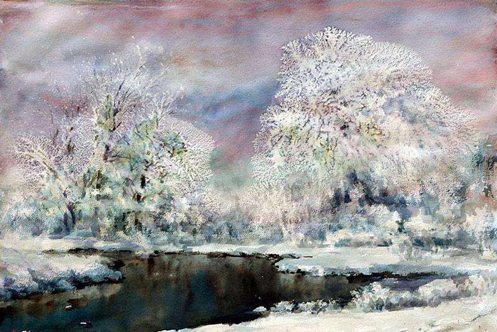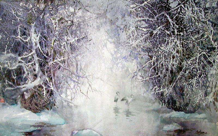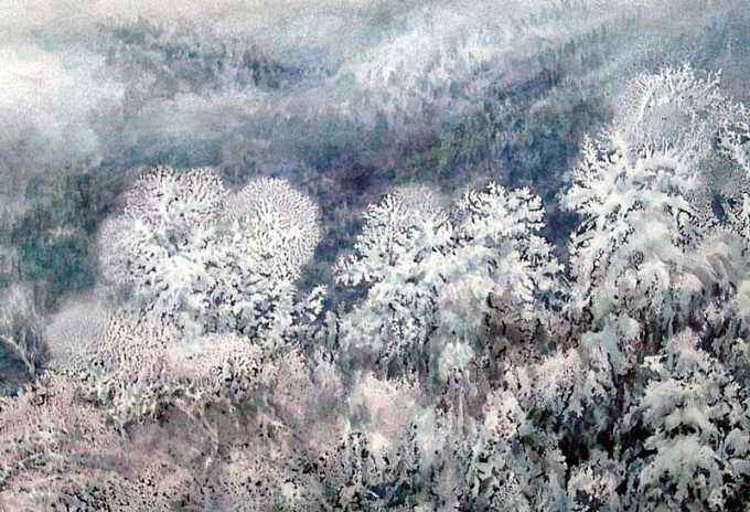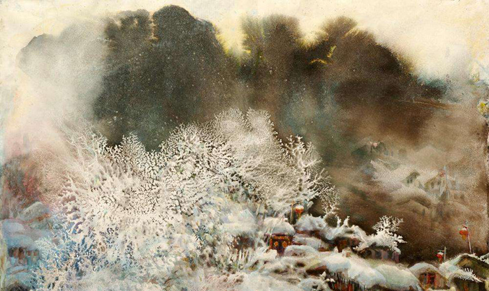 1995年创作的水彩画《初雪》入选“全国第三届水彩、粉画展”;