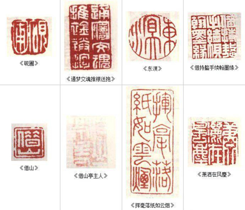 混沌居、江干草堂、石鳌山馆、石鳌馆 、竹西亭、西亭、竹西亭子、北堂、南村草堂、春草堂、种春草堂、六印山房、老竹亭、维摩室、维摩山丈、采芷馆、河干草堂、吉羊(祥)云室、硁石斋、桐楼、修竹亭、十砚千墨之居、艳雪斋、松凤阁、绿阴亭、柴门老树村、桐荫馆、归云庵、北砚斋、松籁阁、墨庄、河上草庐、懋堂、文石山庄(?)、借石亭、桐别馆阴、九如楼(?)、南斋、苍雪轩、半亭、南郭田庄、海天涵碧楼、春草续梦之堂、雪斋、枣花书屋。
