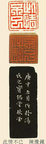 陈豫钟(1762—1806),字耦渔、浚仪,号秋堂、墨缘居主,斋号求是斋,钱塘人。陈豫钟是清代乾嘉时期的著名浙派篆刻家,与丁敬、 蒋仁、 黄易、 奚冈、 陈鸿寿、 赵之琛、 钱松并称 “西泠八家”, 也是 “西泠后四家”的起始人物。
