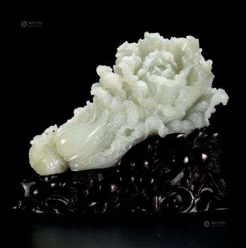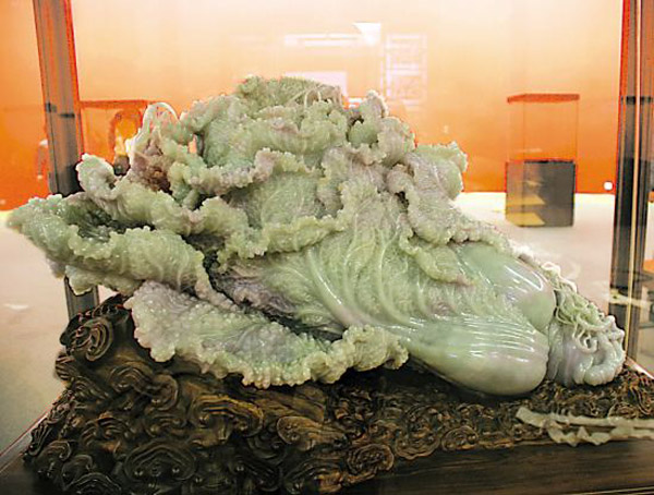 《螳螂白菜》由一块57公斤重的白玉珍品羊脂玉整体雕琢而成,白菜与螳螂栩栩如生,活灵活现,为国宝级珍品,具有极高的审美价值,现为爱涛艺术中心馆藏。